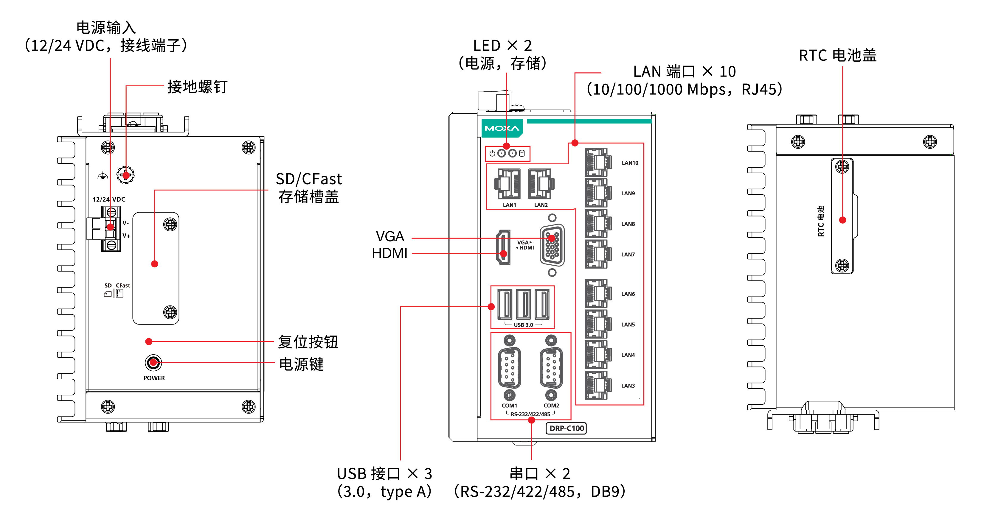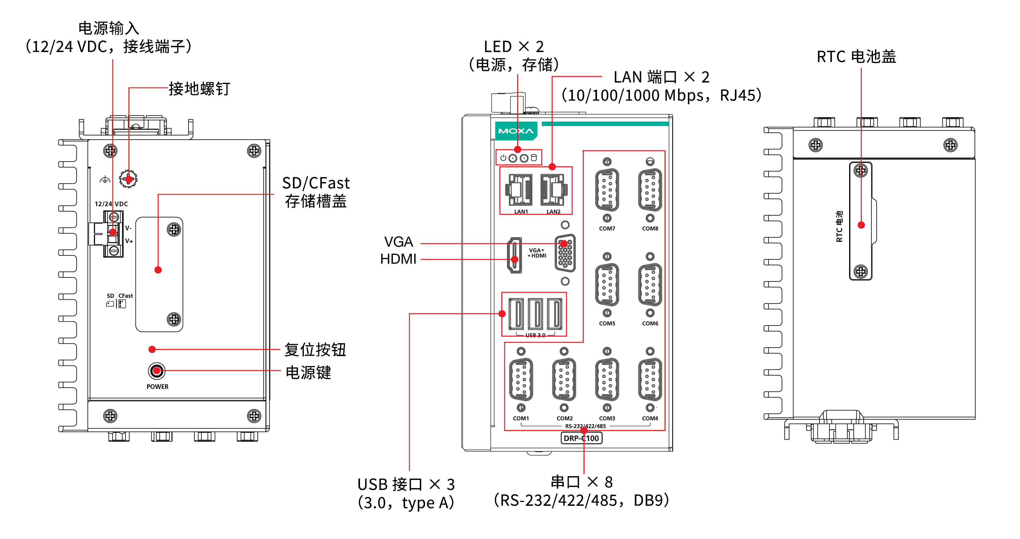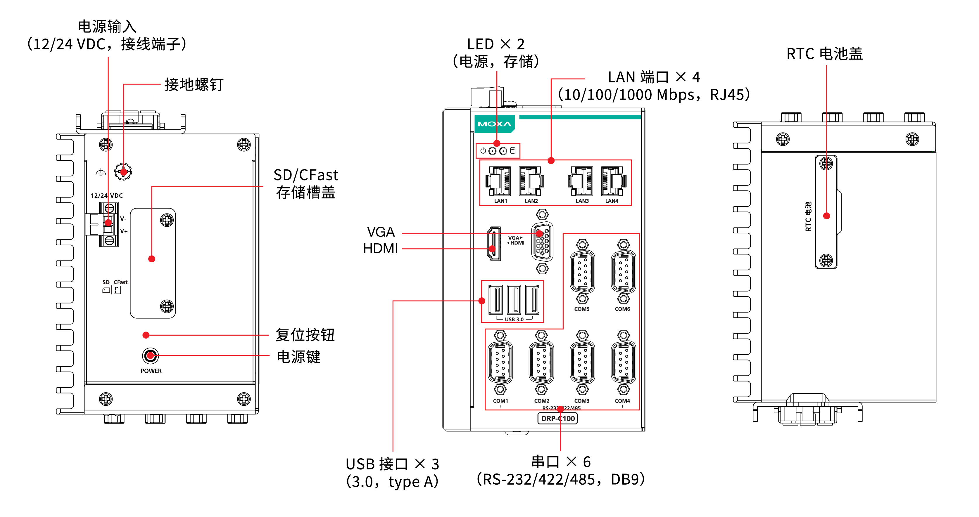 DRP-C100 系列導(dǎo)軌式計(jì)算機(jī)采用 Intel? Celeron?、Intel? Core? i5 或 i7 處理器。這些計(jì)算機(jī)配備了豐富的接口選項(xiàng),其中包括多達(dá) 8 個(gè)軟件可選的 RS-232/422/485 串口,和多達(dá) 10 個(gè)千兆以太網(wǎng)端口。通信接口位于產(chǎn)品的前側(cè)和后側(cè),便于工業(yè)應(yīng)用的訪問和擴(kuò)展。雙存儲(chǔ)設(shè)計(jì),包括 CFast 和 SD 插槽,方便存儲(chǔ)擴(kuò)展。獨(dú)特的電池扣蓋將電池固定在適當(dāng)?shù)奈恢?,并確保在所有操作環(huán)境下的穩(wěn)定性,而電池槽的活板門設(shè)計(jì)使得無需拆卸電池蓋即可輕松更換電池。
