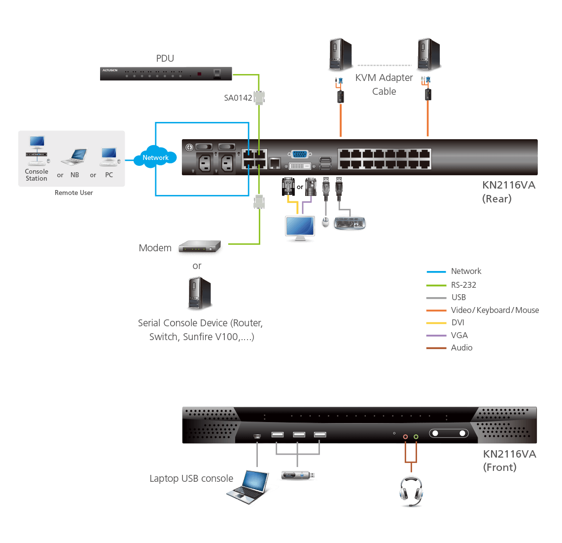 KN系列提供帶外(Out-of-Band;OOB)管理功能,IT管理者能通過獨立于主要/生產網絡以外的管理網絡,管控機房中的網絡裝置(例:服務器、儲存裝置、路由器/交換機)。若無法通過生產網絡訪問網絡裝置,管理者仍可通過此KVM多電腦切換器訪問網絡裝置。KN系列KVM多電腦切換器提供數種帶外訪問方式,包括直接由本地端電腦連接控制端、通過筆電USB端口連接控制端、通過調制解調器進行PSTN連接、或是通過專屬的以太(LAN)管理網絡進行連接。