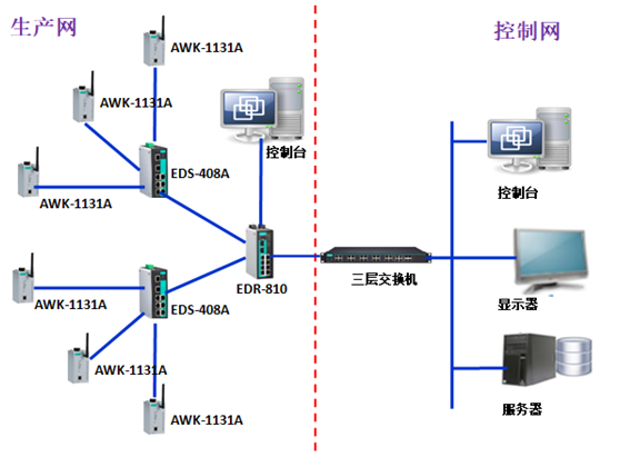 在生產(chǎn)車(chē)間布置大量無(wú)線AP,用于組建車(chē)間無(wú)線局域網(wǎng)。生產(chǎn)工人手持PAD,通過(guò)車(chē)間無(wú)線網(wǎng)絡(luò)把數(shù)據(jù)傳給無(wú)線可接入點(diǎn)(AP:AWK-1131A),MOXA無(wú)線AP再通過(guò)交換機(jī)(EDS-408A)把數(shù)據(jù)匯聚到防火墻(EDR-810)。
