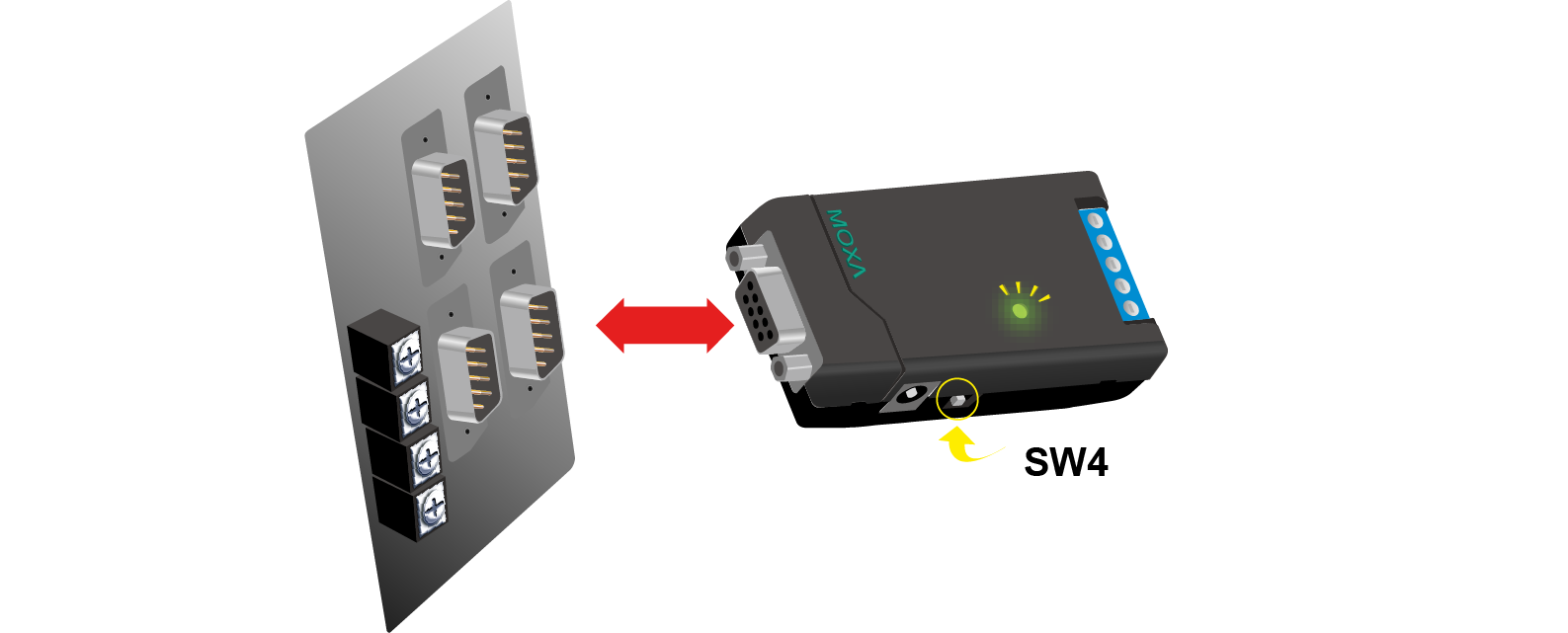 使用萬用表即可輕松檢測串口設(shè)備是否具備足夠電力供電給轉(zhuǎn)換器。TCC-80I 提供更簡單的檢測方式。只需將 TCC-80I 連接至設(shè)備的 RS-232 端口,并將 SW4 開關(guān)設(shè)置為檢測模式。如果專利設(shè)計的電源 LED指示燈亮起,顯示 TCC-80I 供電充足。如果 LED 燈不亮,則需要額外為 TCC-80I 配備外部電源。
