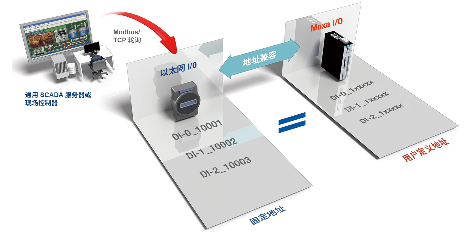 工業(yè)現(xiàn)場(chǎng)需升級(jí)改造,新增的 I/O 設(shè)備需要匹配舊有的 SCADA 或原有的 PLC,以滿足無縫無痛升級(jí)的體驗(yàn)。ioLogik E1200 支持用戶自定義的 Modbus/TCP 地址管理功能,提供了簡(jiǎn)化的配置和更大的靈活性。用戶只需配置功能和地址映射即可滿足所需,而不必為個(gè)別設(shè)備煩惱。