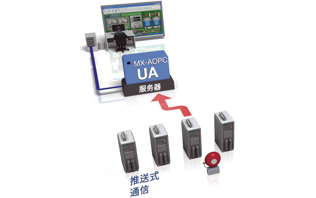 MX-AOPC UA 服務(wù)器提供 I/O 設(shè)備主動(dòng)推送通信功能,將狀態(tài)和/或事件的變化傳送至 SCADA 系統(tǒng)。與輪詢系統(tǒng)不同,使用推送技術(shù)與 SCADA 系統(tǒng)通信時(shí),只有當(dāng)狀態(tài)發(fā)生變化或定義的事件發(fā)生時(shí)才會(huì)推送消息,進(jìn)而提升準(zhǔn)確度和減少需要傳輸?shù)臄?shù)據(jù)量。