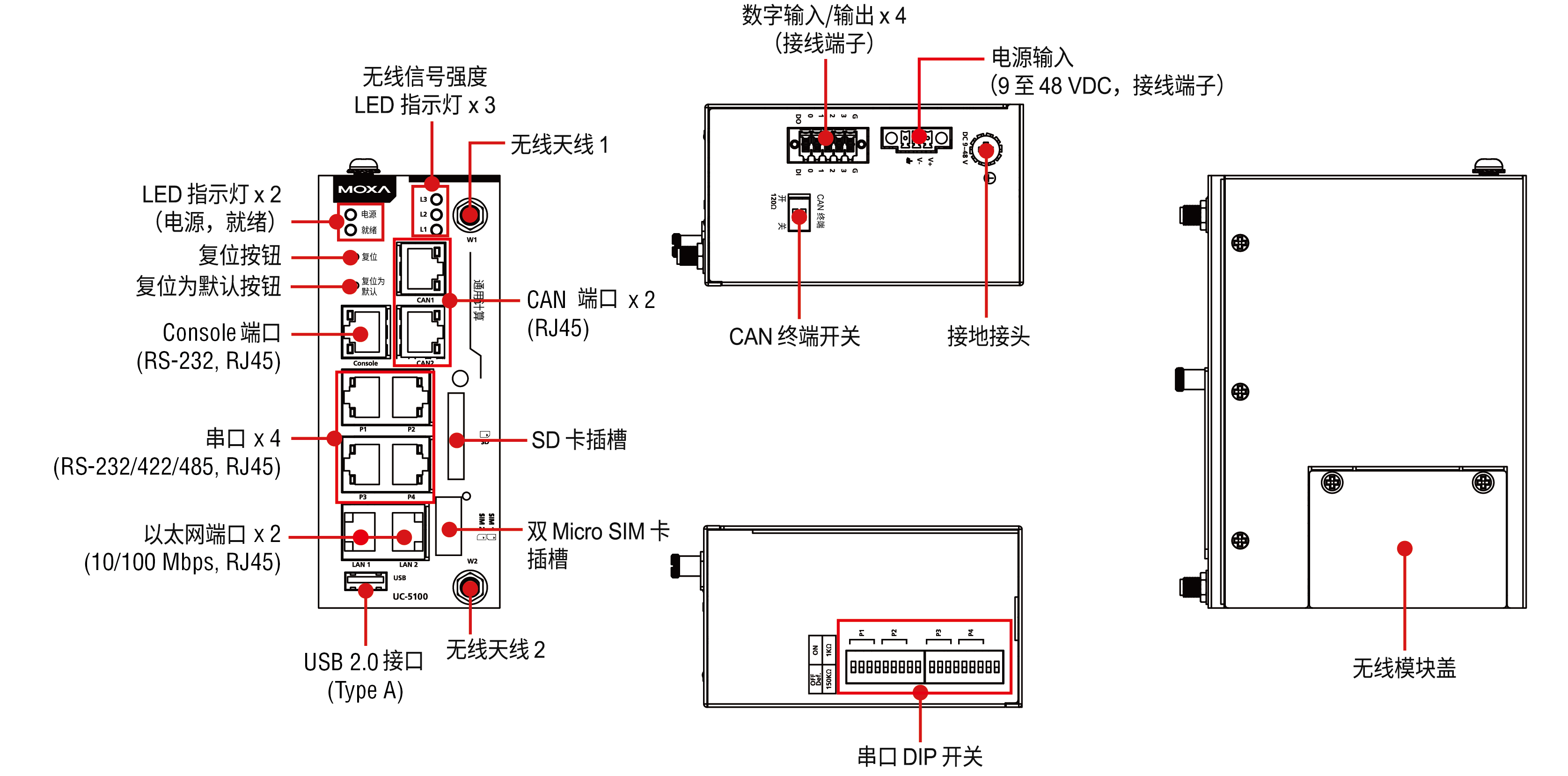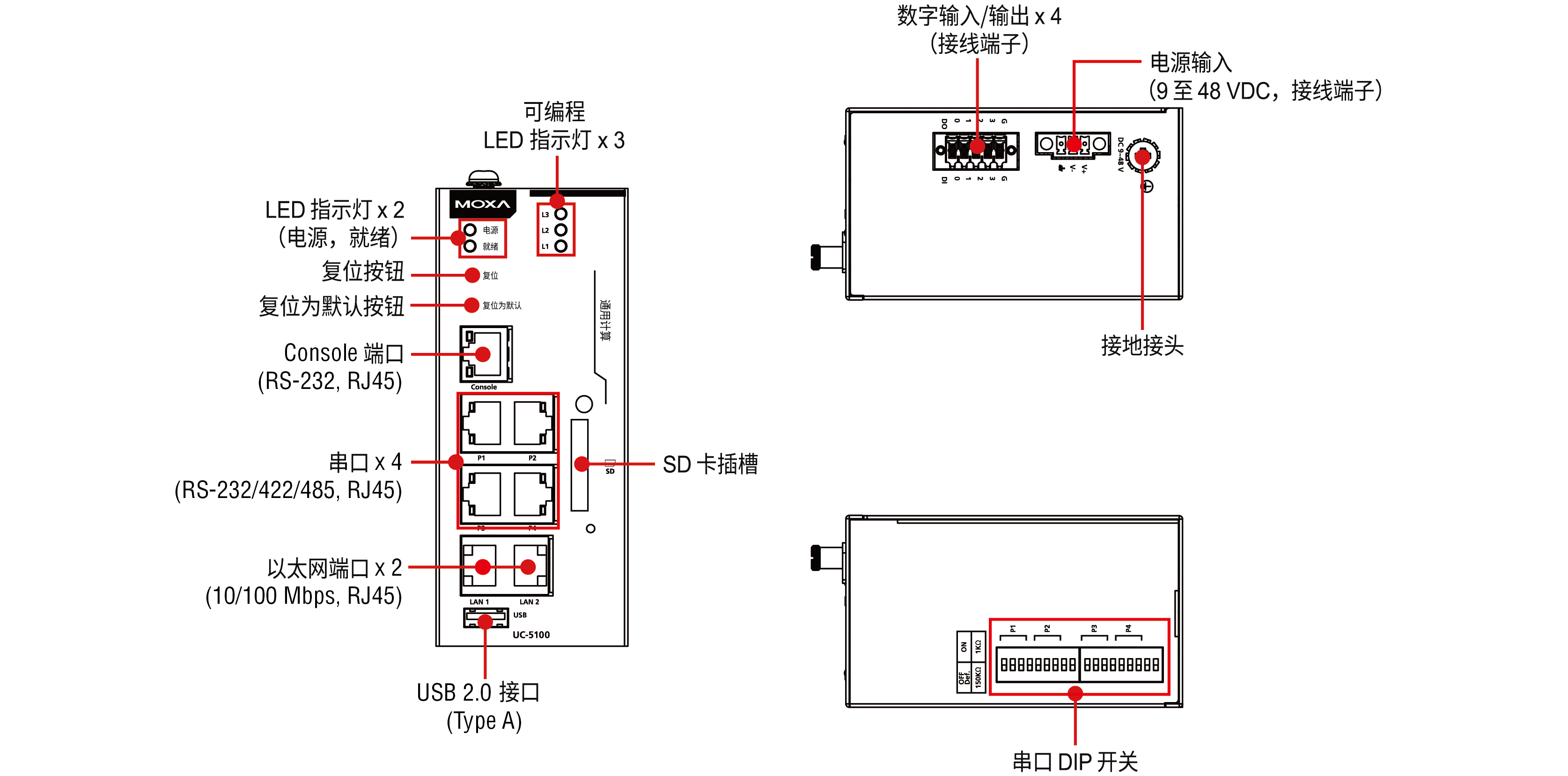 按鈕: 復(fù)位按鈕,可用于配置串口和 CAN 端口的 DIP 開關(guān)
