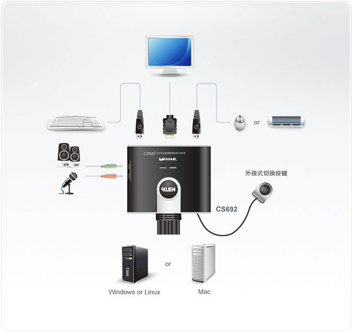 CS692 USB HD音頻/視頻KVM多電腦切換器可通過(guò)單一USB鍵盤(pán)、USB鼠標(biāo)及HD顯示器控制端操作2臺(tái)HD接口電腦。該創(chuàng)新產(chǎn)品提供了完整的HDMI功能、USB 2.0接口設(shè)備分享(通過(guò)附加的USB鼠標(biāo)連接端口)、及固件更新的功能,