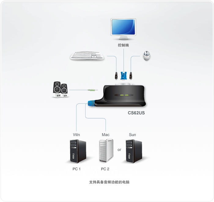 ATEN提供完整的USB KVM解決方案。CS62US可連結(jié)兩臺USB電腦至一臺USB控制端,并兼容于所有操作系統(tǒng),包括PC, Mac及Sun。