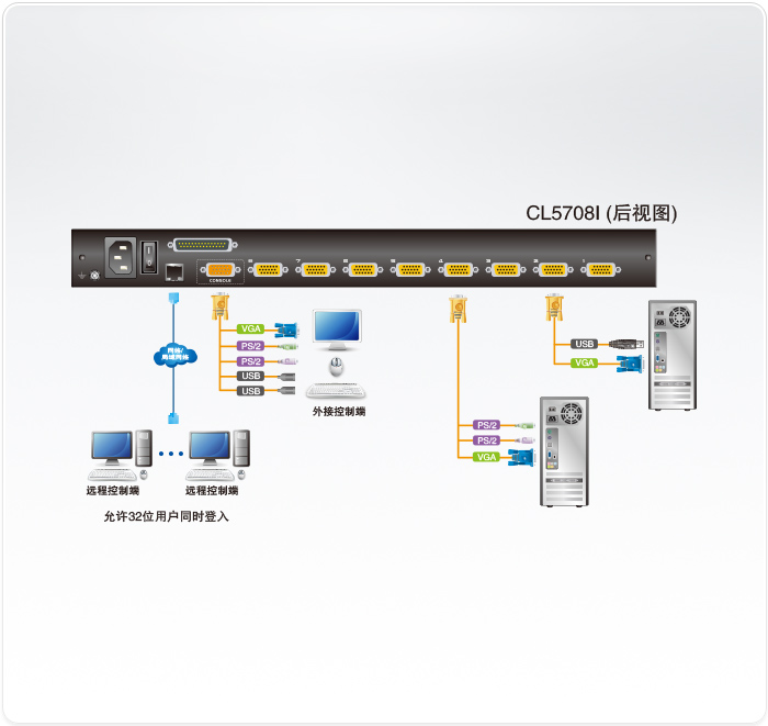 8端口PS/2-USB VGA LCD KVM over IP切換器 支持菊式串接以及USB外圍設備連接端口功能