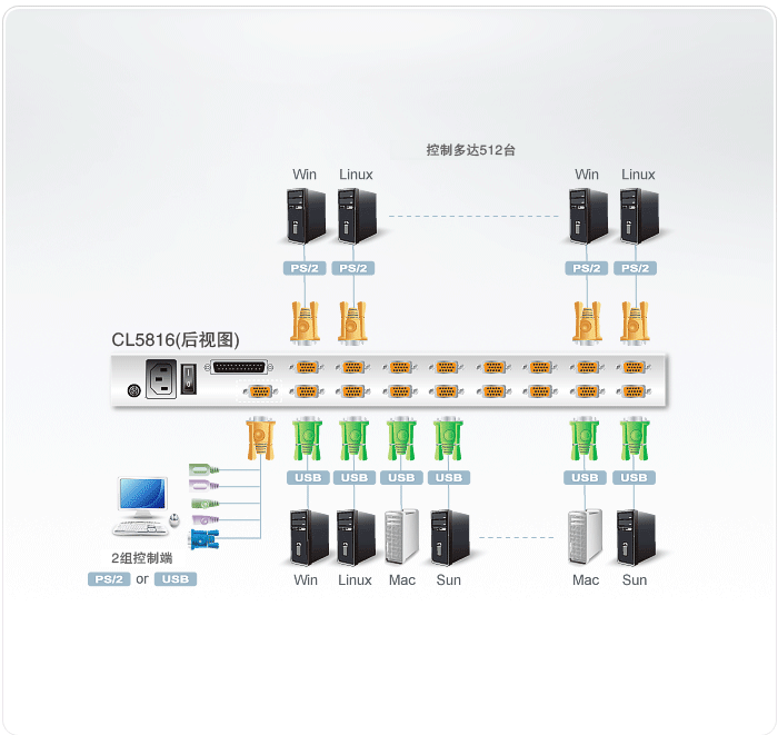 CL5816支持配備PS/2或USB鍵盤(pán)與鼠標(biāo)的服務(wù)器與USB接口的接口設(shè)備。單一控制端可管理高達(dá)16臺(tái)服務(wù)器。通過(guò)菊式串接方式,可再串接多達(dá)31臺(tái)KVM多電腦切換器,用戶便能從單一鍵盤(pán)、觸控顯示器、及鼠標(biāo)控制端管理多達(dá)512臺(tái)服務(wù)器。