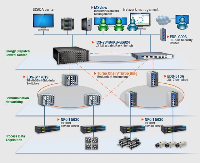 Moxa的3層機(jī)架式交換機(jī)和緊湊型導(dǎo)軌式交換機(jī)都支持EtherNet/IP和Modbus/TCP工業(yè)協(xié)議,方便的實(shí)現(xiàn)自動(dòng)化系統(tǒng)集成。Moxa NPort系列設(shè)備聯(lián)網(wǎng)服務(wù)器主要安裝在設(shè)備層,允許分布式數(shù)據(jù)通過串口將數(shù)據(jù)傳輸至以太網(wǎng)。為了提升傳輸?shù)男?,EDR-G903系列千兆路由器為外部數(shù)據(jù)通訊提供保護(hù),免受來自網(wǎng)絡(luò)的攻擊。