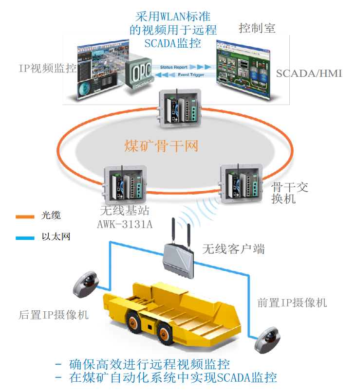 采礦本身非常危險(xiǎn)。地下采礦需要有效可靠的覆蓋整個(gè)礦井的通訊系統(tǒng),來維持平穩(wěn)運(yùn)行并保證礦工的安全。傳統(tǒng)的有線網(wǎng)絡(luò)很難遍布到復(fù)雜多層的礦井網(wǎng)絡(luò)中的所有彎道角落。無線局域網(wǎng)提供了寬范圍的移動(dòng)性,不再受線纜束縛,有足夠大的帶寬保證采礦操作平。采用WLAN視頻遠(yuǎn)程監(jiān)控能夠讓操作員在控制室內(nèi)安全地操作,同時(shí)能夠?qū)Φ叵聼o人駕駛車的運(yùn)動(dòng)進(jìn)行監(jiān)控。