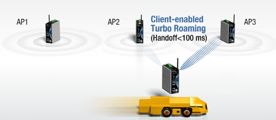 基于Client的 Turbo Roaming技術(shù)(漫游切換時(shí)間 < 100 ms)。采用IEEE 802.11技術(shù)的網(wǎng)絡(luò)有效覆蓋范圍僅有幾百米,因此,當(dāng)Client位于移動(dòng)的物體上時(shí),需要在不同的AP之間漫游。Moxa專有的TurboRoaming技術(shù)能夠?qū)崿F(xiàn)快速漫游,切換時(shí)間小于100ms,從而確保了車輛從一個(gè)AP覆蓋區(qū)域進(jìn)入另外一個(gè)AP覆蓋區(qū)域時(shí),視頻數(shù)據(jù)流更順暢,延時(shí)更低。