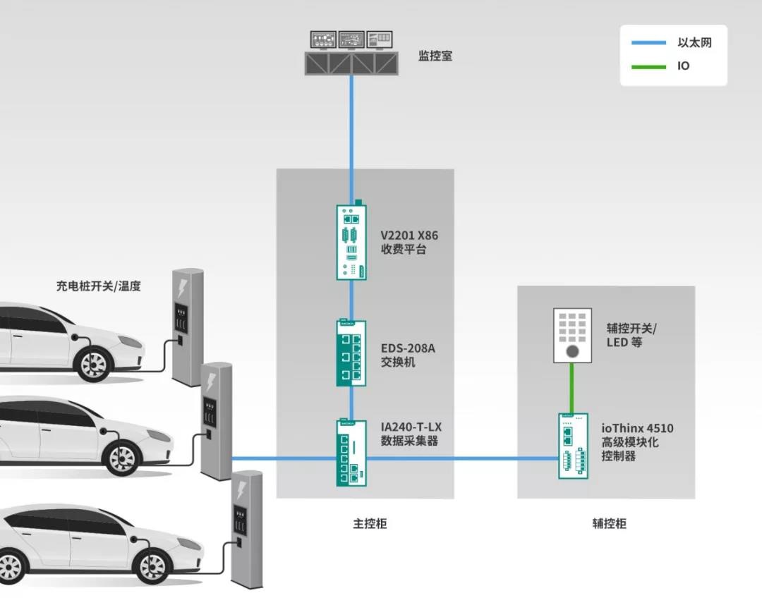 周邊多個(gè)充電樁通訊網(wǎng)絡(luò)通過(guò) Zigbee 等無(wú)線方式相互串連,數(shù)據(jù)再由交換機(jī)等產(chǎn)品匯聚至 ioThinx。該設(shè)備搭載 X86 架構(gòu)平臺(tái),功能強(qiáng)大,滿足客戶(hù) 10 個(gè)充電樁為一組的接入需求。同時(shí),ioThinx 還包括控制開(kāi)關(guān),一臺(tái)設(shè)備便可解決所有難題。