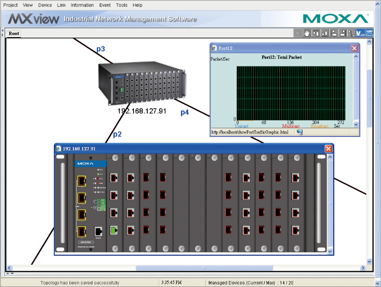 網(wǎng)絡(luò)管理軟件采用MOXA的MXView網(wǎng)管軟件,它采用圖形化設(shè)計(jì),能夠管理到所有網(wǎng)絡(luò)設(shè)備的每一個(gè)端口,包括端口的配置,告警,流量監(jiān)控、分析,以便網(wǎng)絡(luò)管理員能快速、準(zhǔn)確地檢查整體網(wǎng)絡(luò)的運(yùn)行情況,有效找到網(wǎng)絡(luò)故障點(diǎn),快速診斷并在故障蔓延以前加以排除。本方案提供的網(wǎng)絡(luò)管理軟件還提供通用軟件接口,便于集中監(jiān)控系統(tǒng)對(duì)通信網(wǎng)絡(luò)設(shè)備的監(jiān)控。