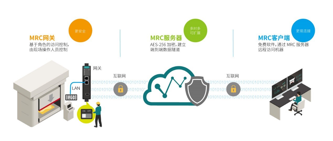 在眾多遠(yuǎn)程連接解決方案中,Moxa MRC 因多重優(yōu)勢脫穎而出,如全面的端到端安全性、便捷性、基于云的靈活性、不懼工廠惡劣條件考驗(yàn)的可靠性等。只需 MRC 網(wǎng)關(guān)、云服務(wù)器和客戶端軟件三個(gè)組件,即可建立基于云的遠(yuǎn)程訪問連接。